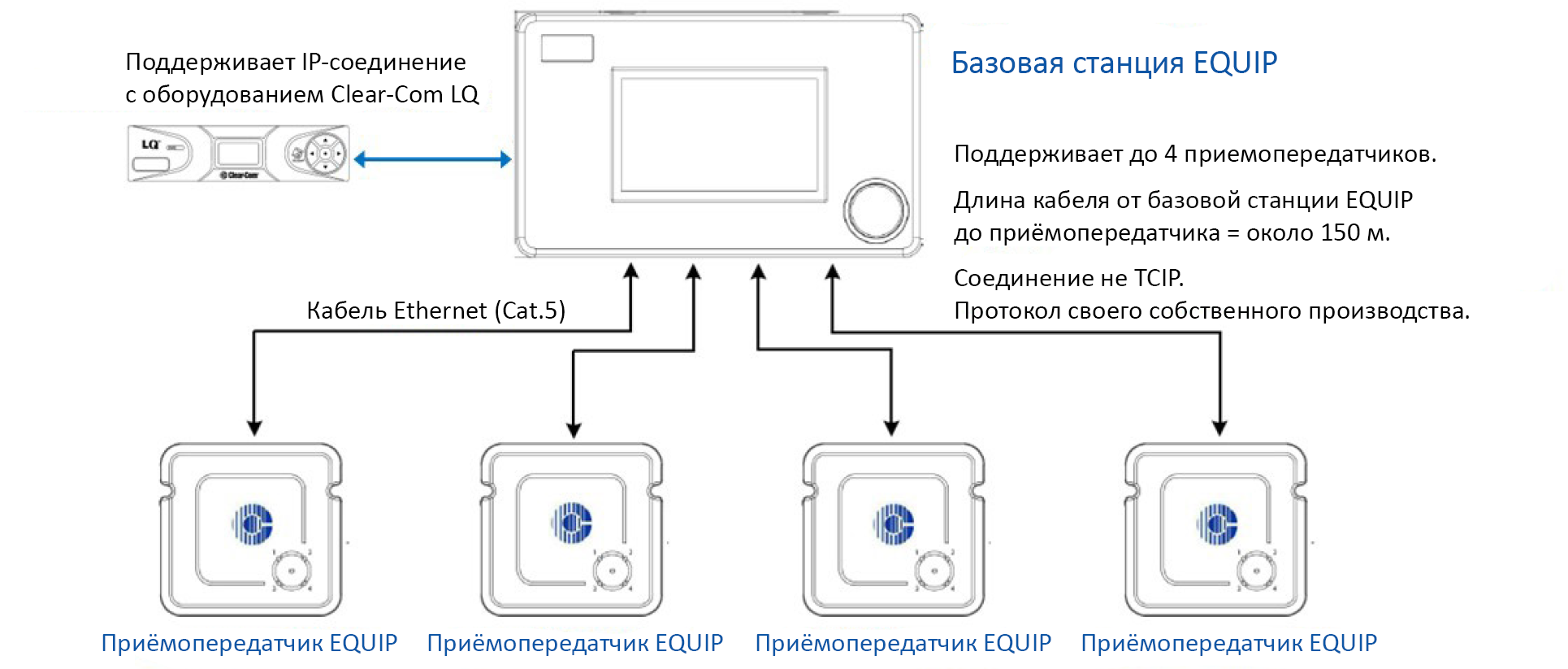 EQUIP – это беспроводная система высокой плотности, поддерживающая 40 гарнитур при использовании с четырьмя распределенными приемопередатчиками. Она обеспечивает расширенные зоны покрытия с возможностью бесперебойного роуминга. Система поддерживает 10 одновременных полнодуплексных связей. Четыре проводных аудиосоединения обеспечивают удаленную интеграцию двух каналов при подключении к дополнительным аудиосистемам.