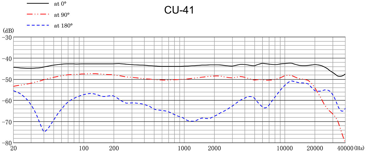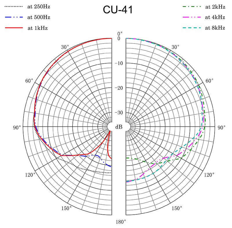 С выходом в свет Sanken CU-41 установлена новая очень высокая планка для производителей микрофонов для записи музыки. Этот микрофон используется в музыкальных студиях всего мира. Он передает по-настоящему естественное, не окрашенное звучание. Уникальный двухкапсюльный преобразователь обеспечивает плоскую частотную характеристику. Причем характеристика практически линейна не только на оси, но также и под углом 90°, и даже в 135°. Эта уникальная способность очень важна, если необходимо добиться настоящей прозрачности. CU-41 используется также дикторами телевидения и радио. Этот микрофон – образец кардиоиды с низким эффектом близости.